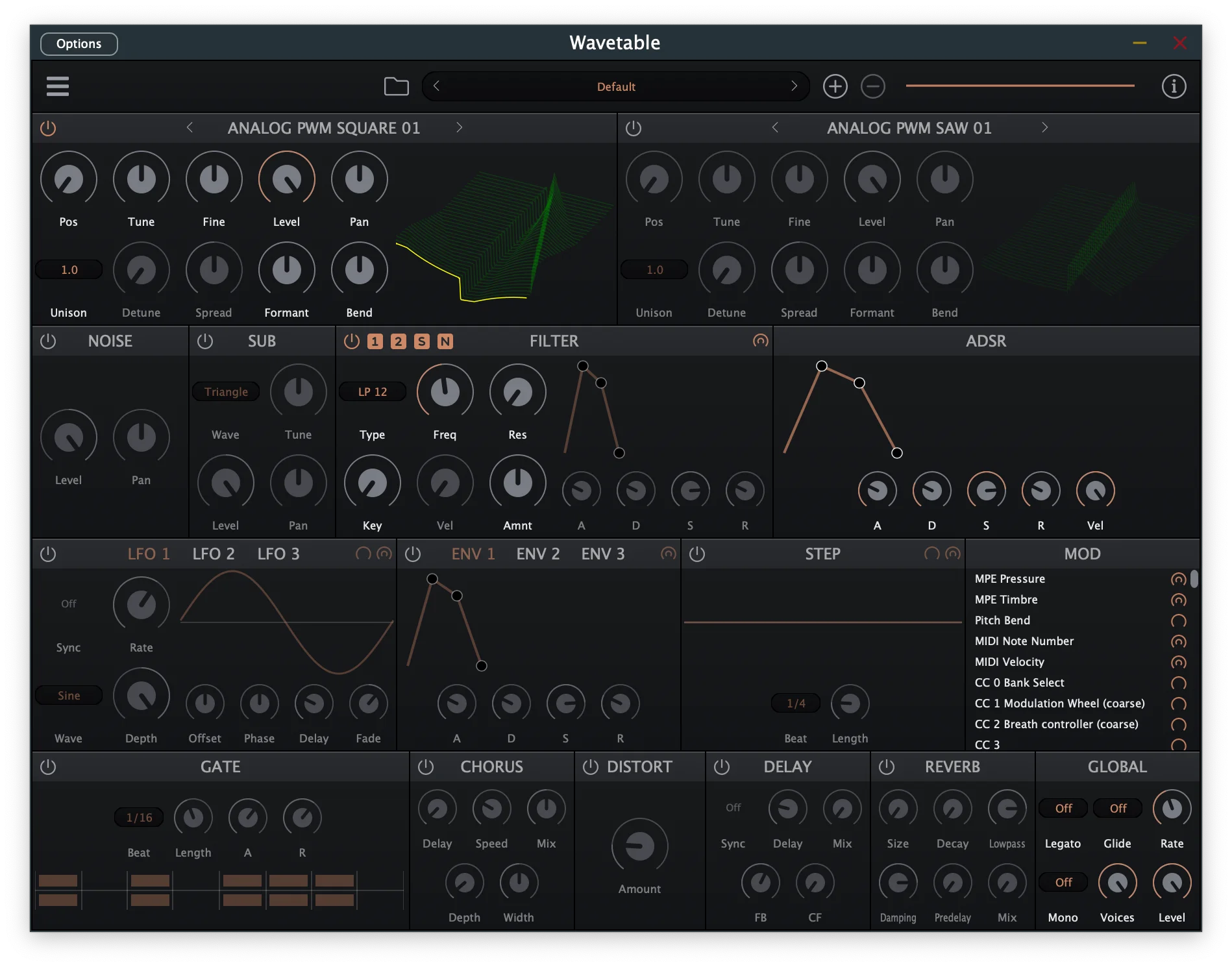 Build me an 808-focused bass synth with ladder-filter weight, saturated low-end punch, and a playable preset bank for trap and bass-heavy production.